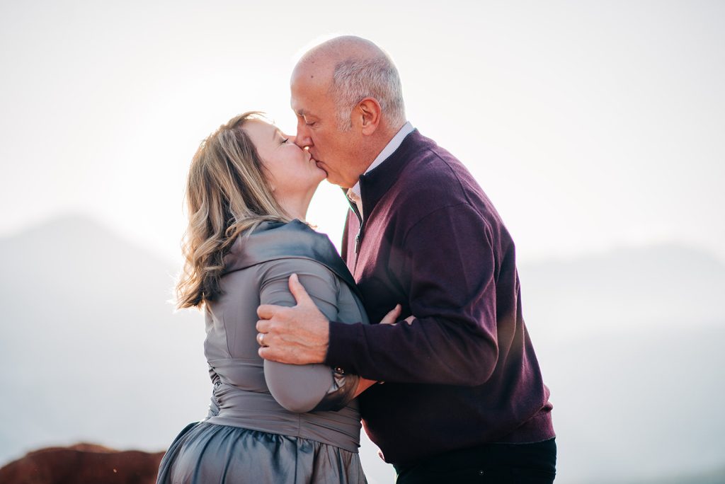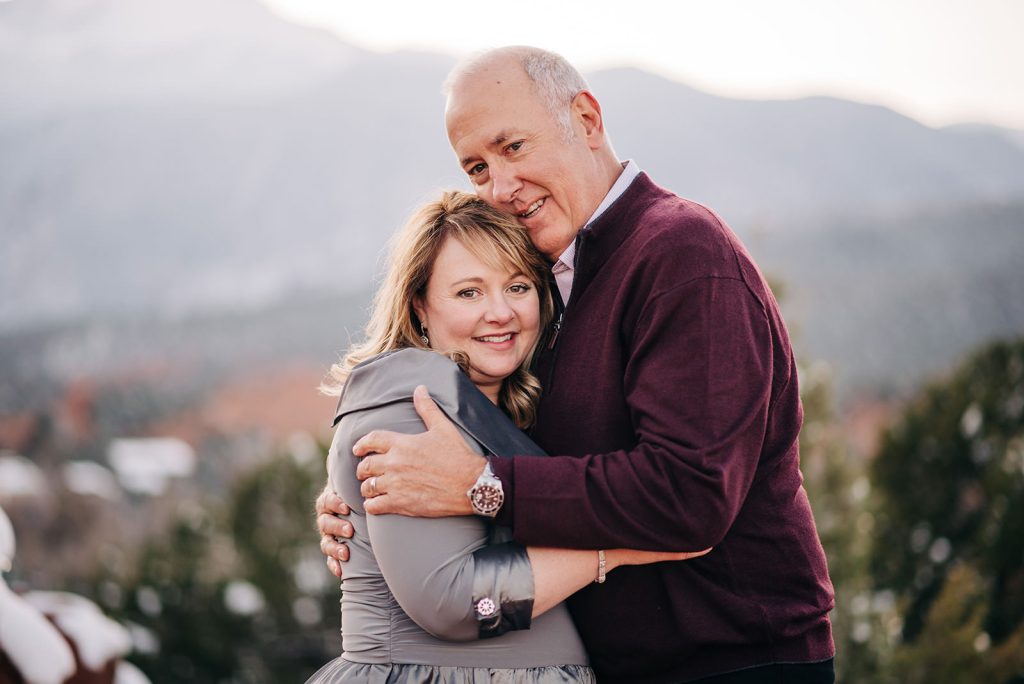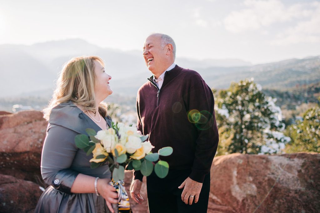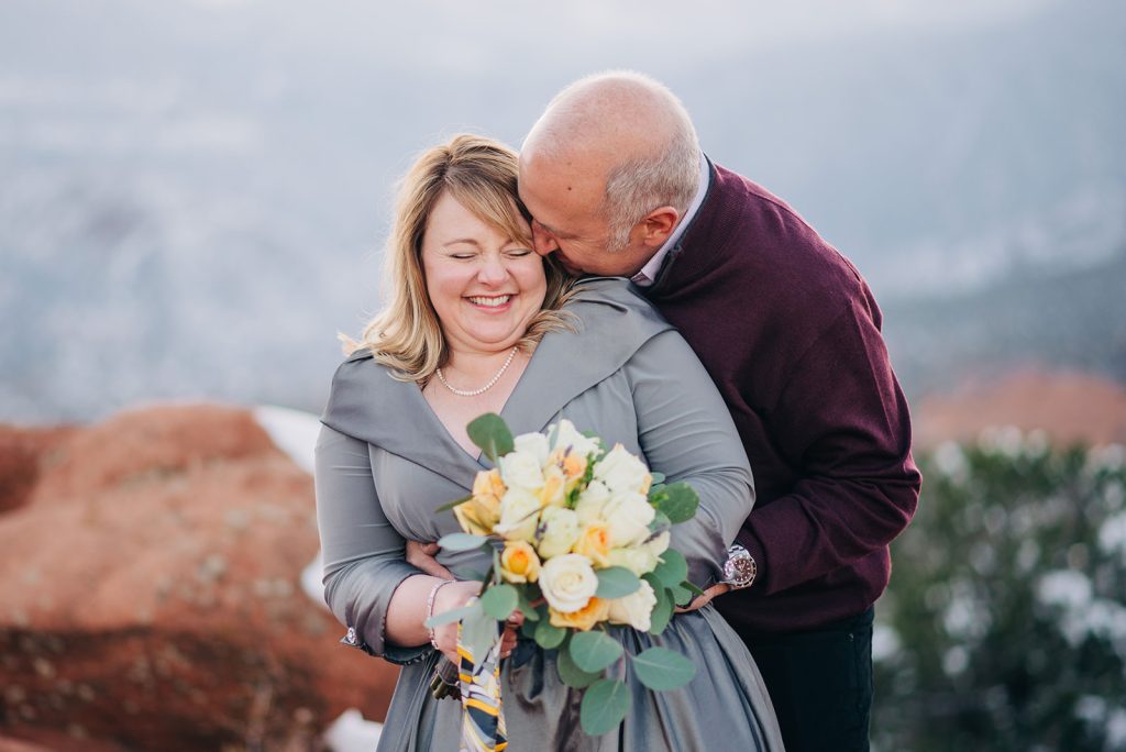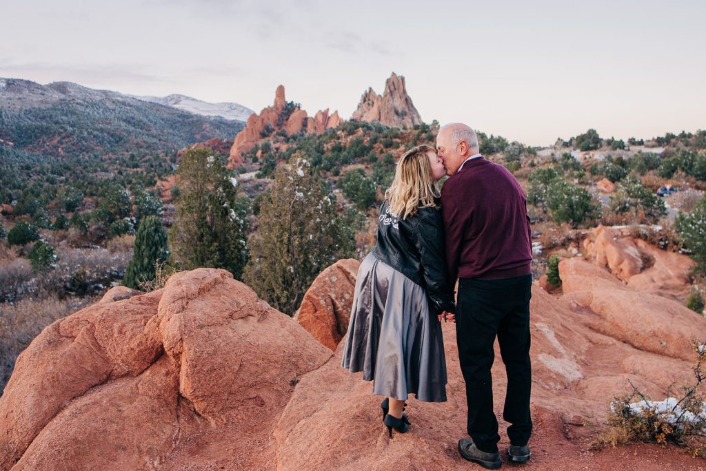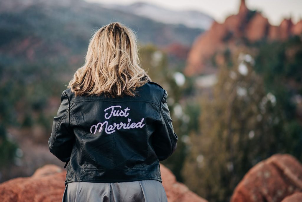 Fresh snow blanketed Garden of the Gods the day they eloped, and instead of stressing about it, they leaned in. Jerry in his suit, Pamela in her dress and a leather “Just Married” jacket that absolutely delivered, standing at High Point with Pikes Peak rising up behind them. Just them, their officiant, and the kind of golden light that only happens when the sun decides to cooperate right before it disappears.