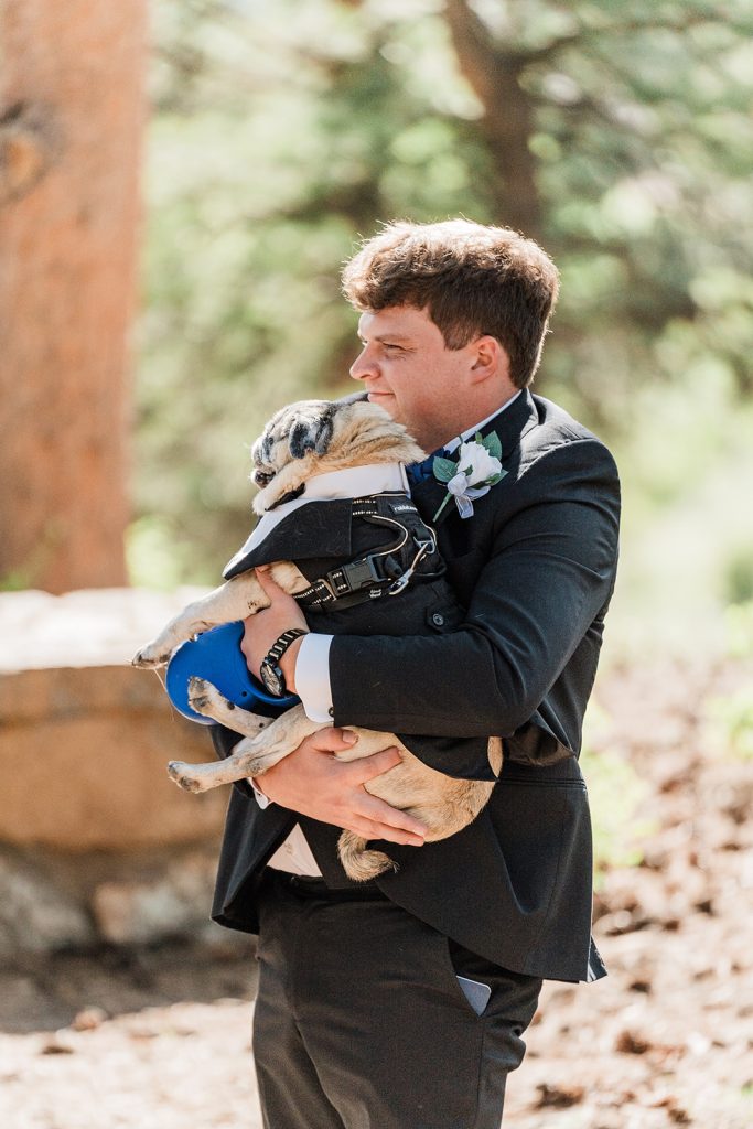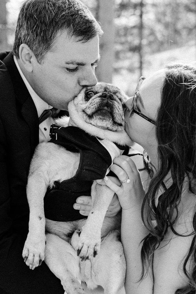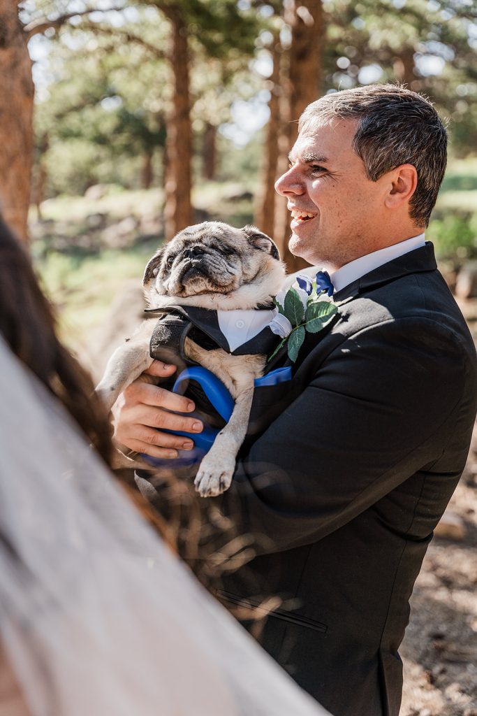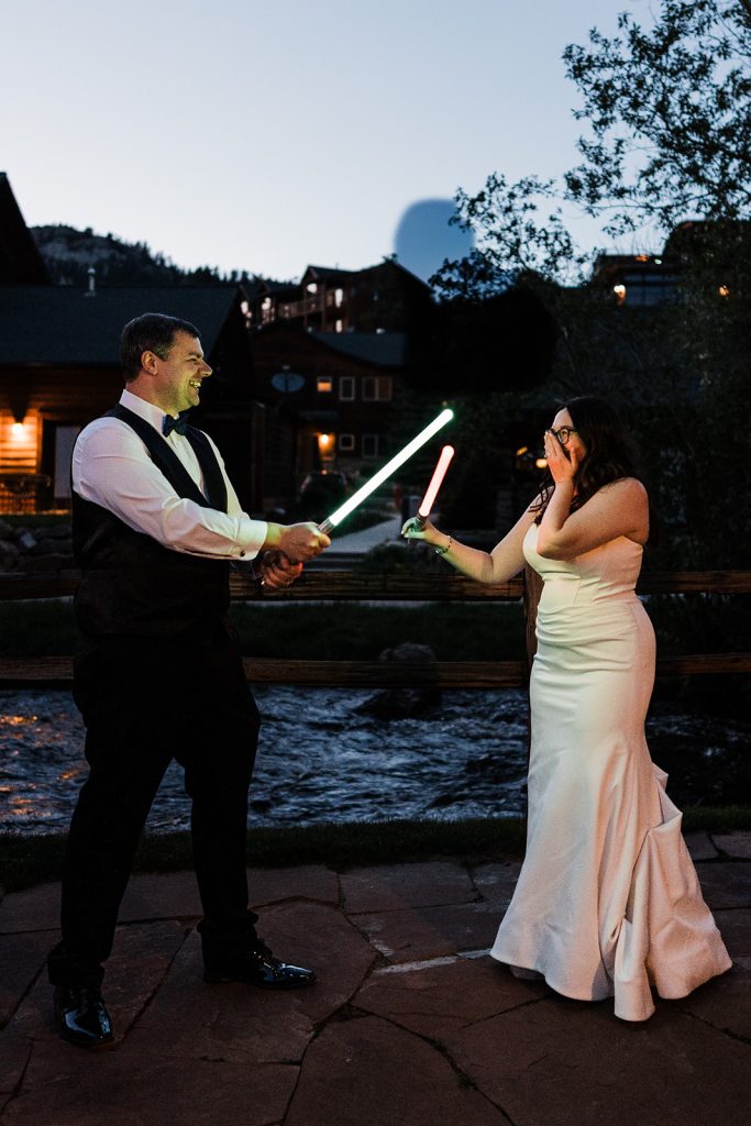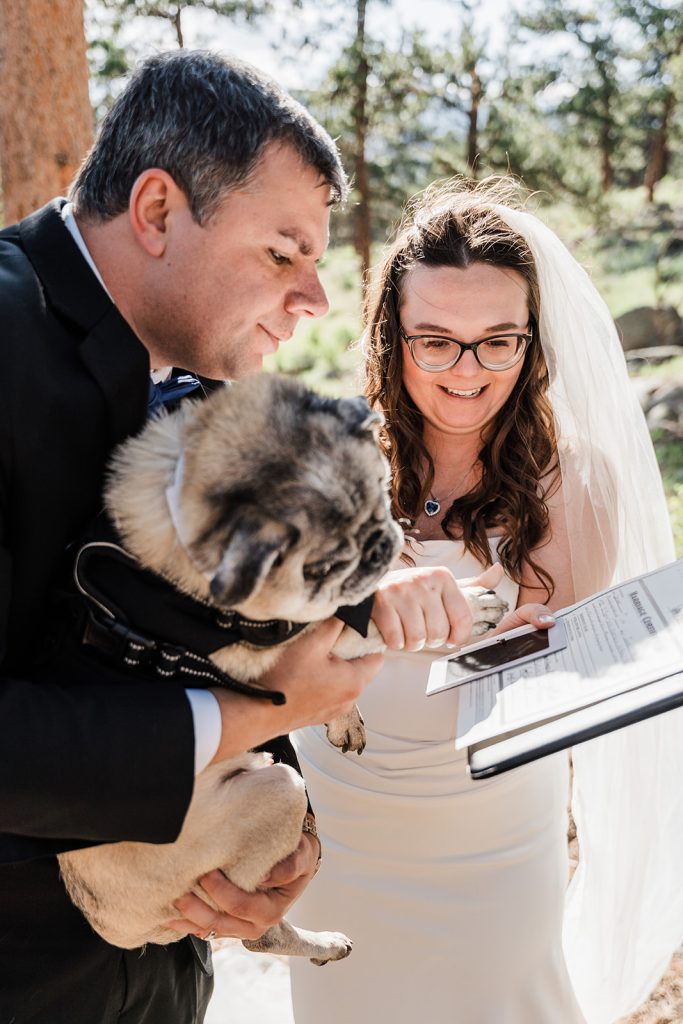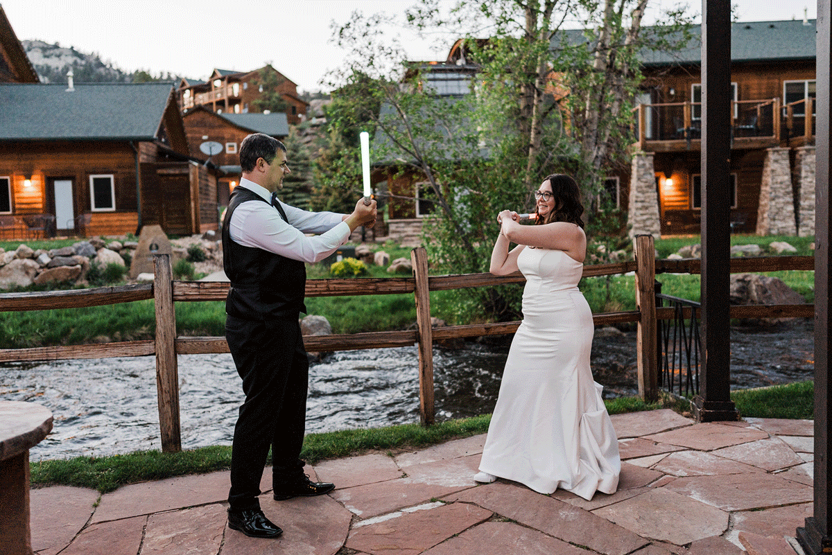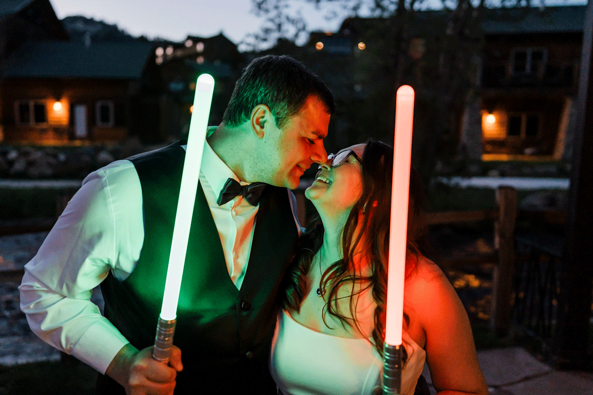The day itself unfolded with sweet little moments stitched in between big ones. They started with a first look and portraits at Sprague Lake, soaking in the calm before heading to the Moraine Park Amphitheater for their ceremony. Their one-eyed pug, Milo, even served as witness for their marriage license—paw print and all. After the ceremony, they celebrated back at their lodge in Estes Park with family, sharing dinner, toasts, dancing, and plenty of laughter. As the evening settled in, we stole away for blue-hour portraits, complete with lightsabers that turned the mountains into their own private galaxy.