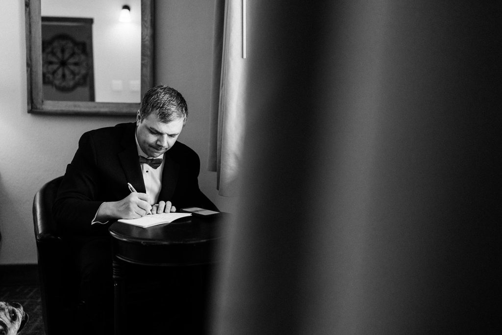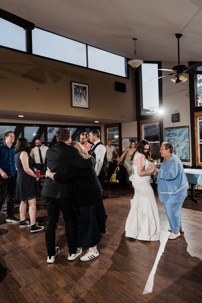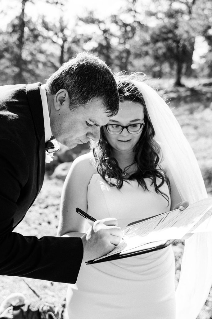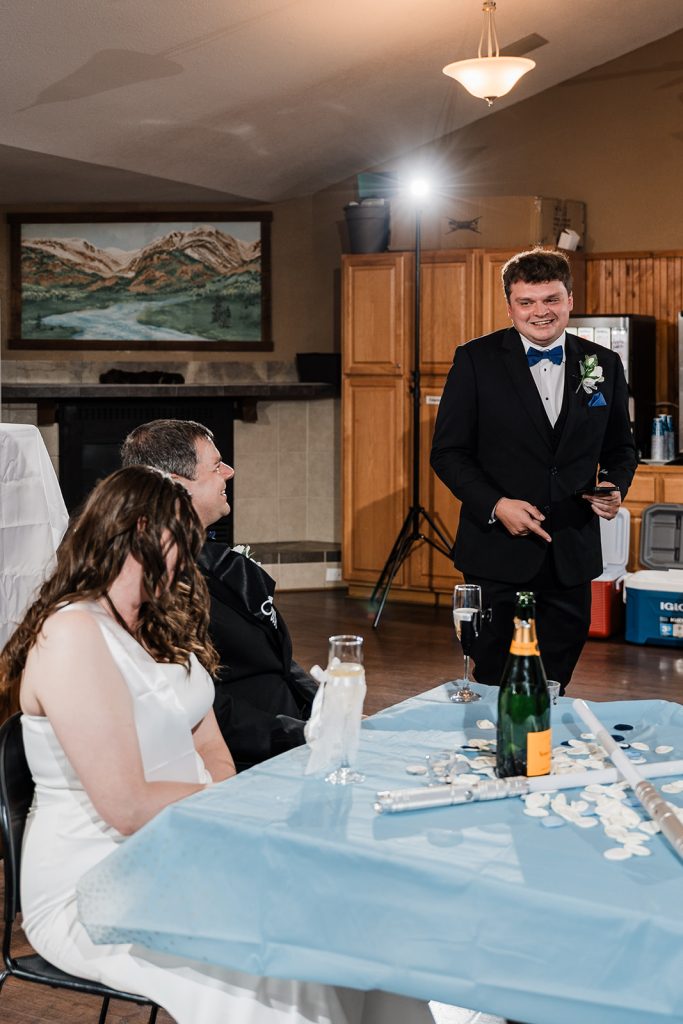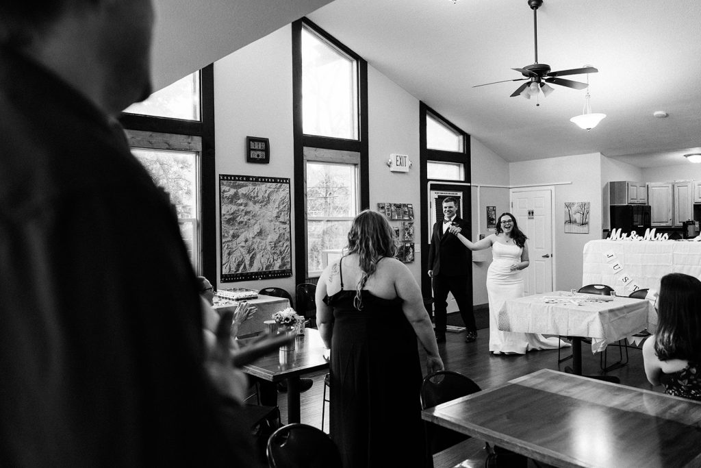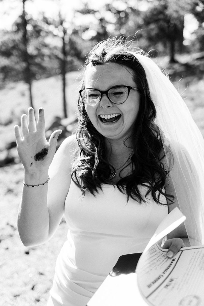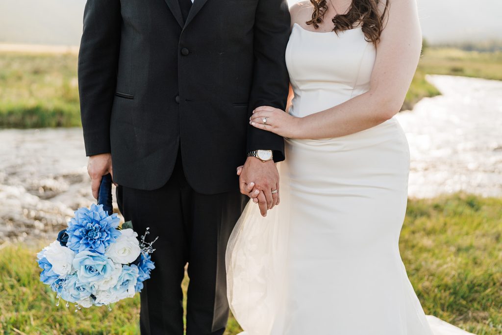 The day itself unfolded with sweet little moments stitched in between big ones. They started with a first look and portraits at Sprague Lake, soaking in the calm before heading to the Moraine Park Amphitheater for their ceremony. Their one-eyed pug, Milo, even served as witness for their marriage license—paw print and all. After the ceremony, they celebrated back at their lodge in Estes Park with family, sharing dinner, toasts, dancing, and plenty of laughter. As the evening settled in, we stole away for blue-hour portraits, complete with lightsabers that turned the mountains into their own private galaxy.