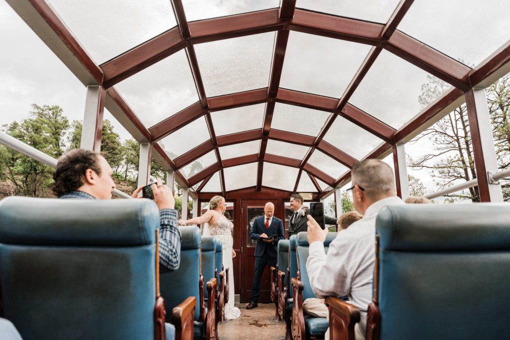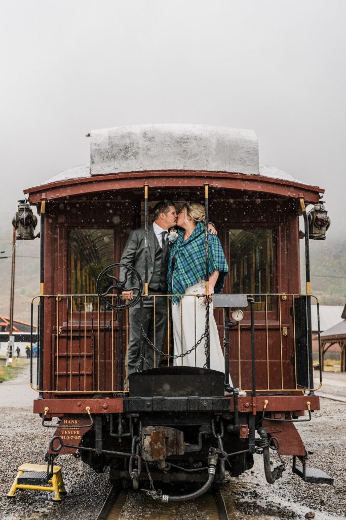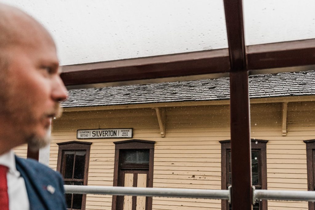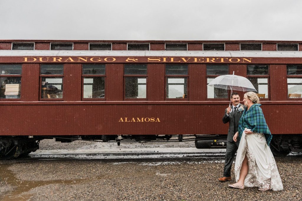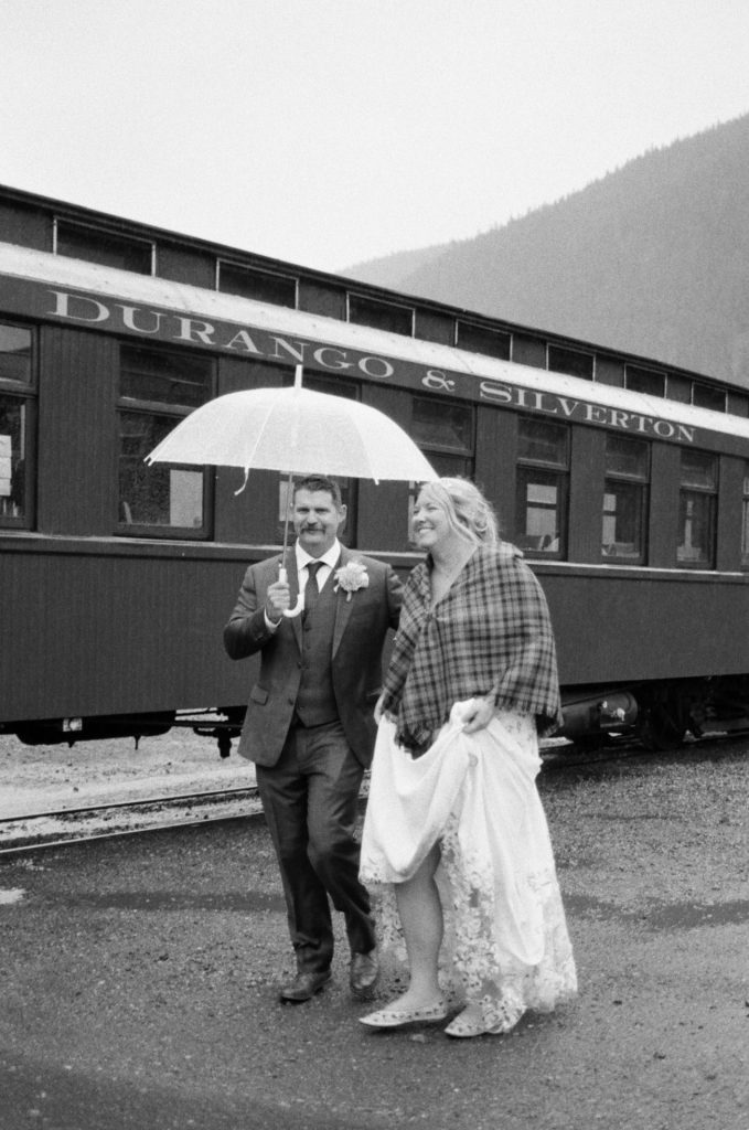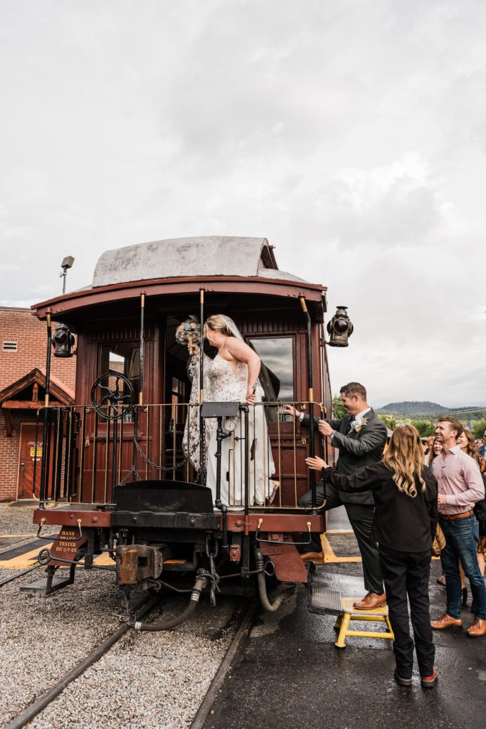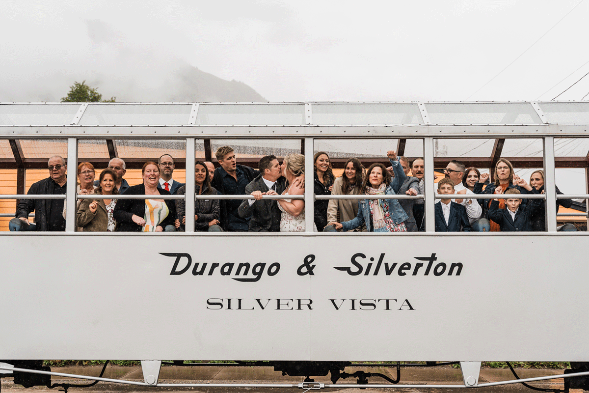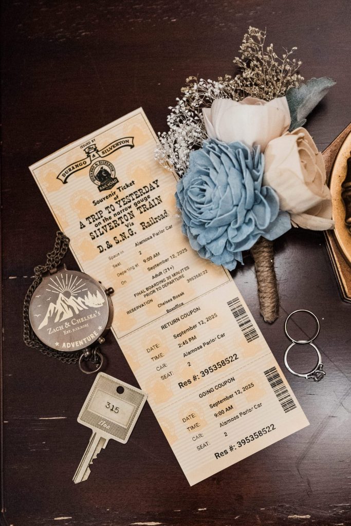 Their wedding day kicked off in true Colorado style—with unpredictable weather. Chelsea got ready at the General Palmer Hotel in Durango, sharing moments with mom and dad as they helped her into her dress, while Zach prepped in the hotel lobby, perfecting his tie and jacket for the big day. A first look set the tone for the day, intimate and full of anticipation, before the couple walked the short distance to the train depot to board the Durango Silverton Narrow Gauge Railroad. As the train chugged along the mountains, they said their vows, signed the marriage license, and celebrated with cake and breakfast while small family photos captured the start of their married life. The day’s adventure was only heightened by the weather—shortly after their ceremony, the skies opened up and rain poured down for the rest of the day, adding a dramatic soundtrack to their journey.
