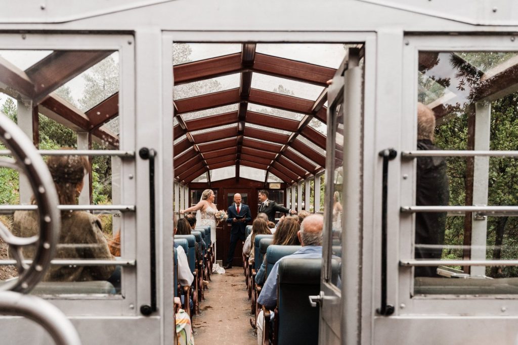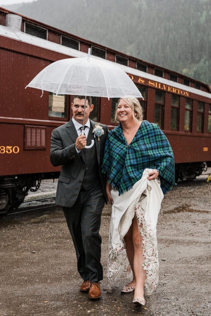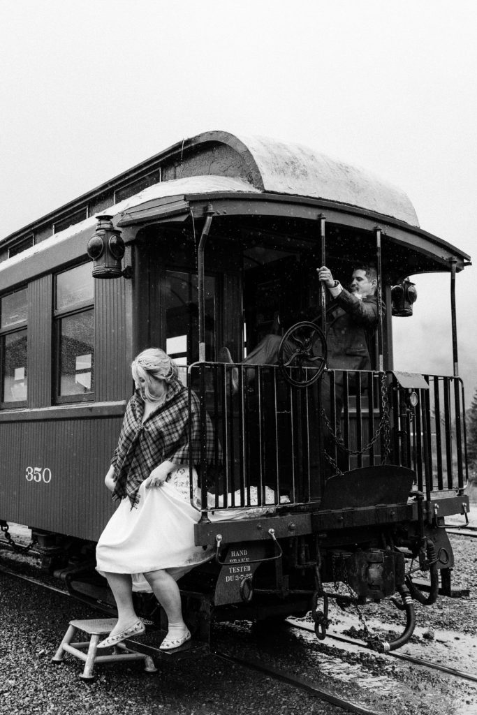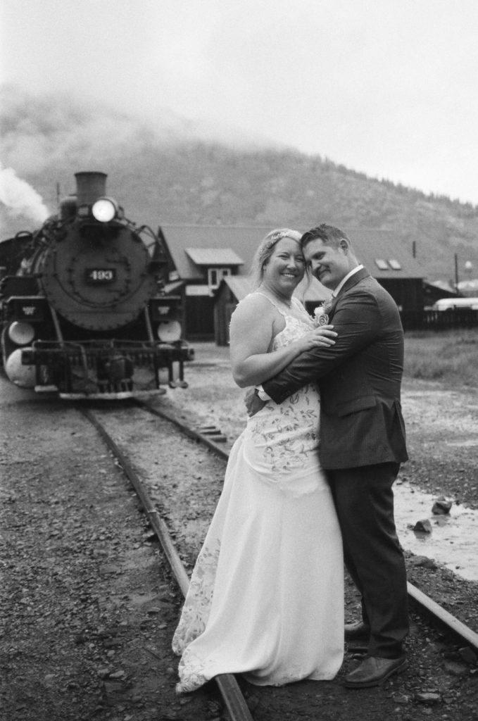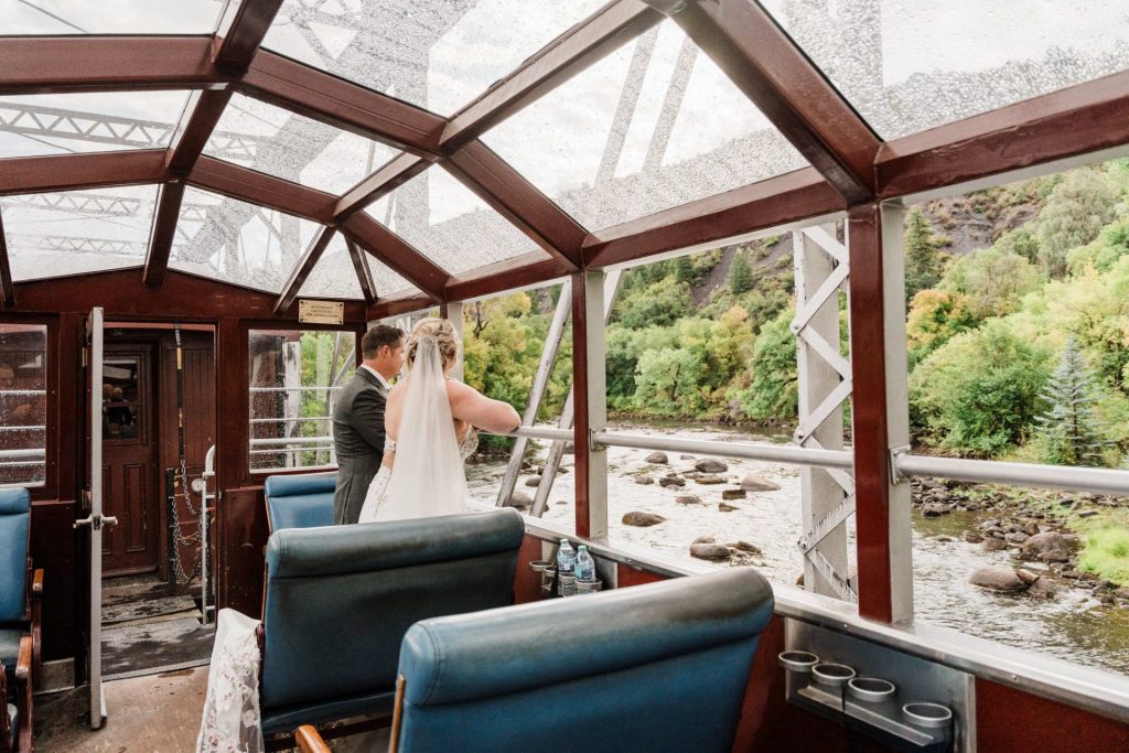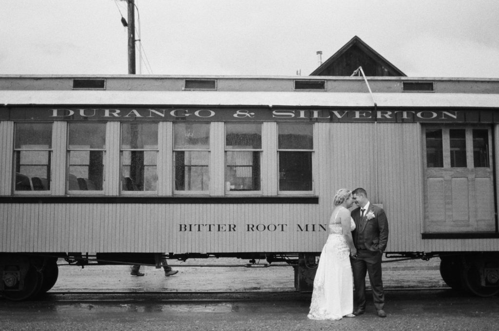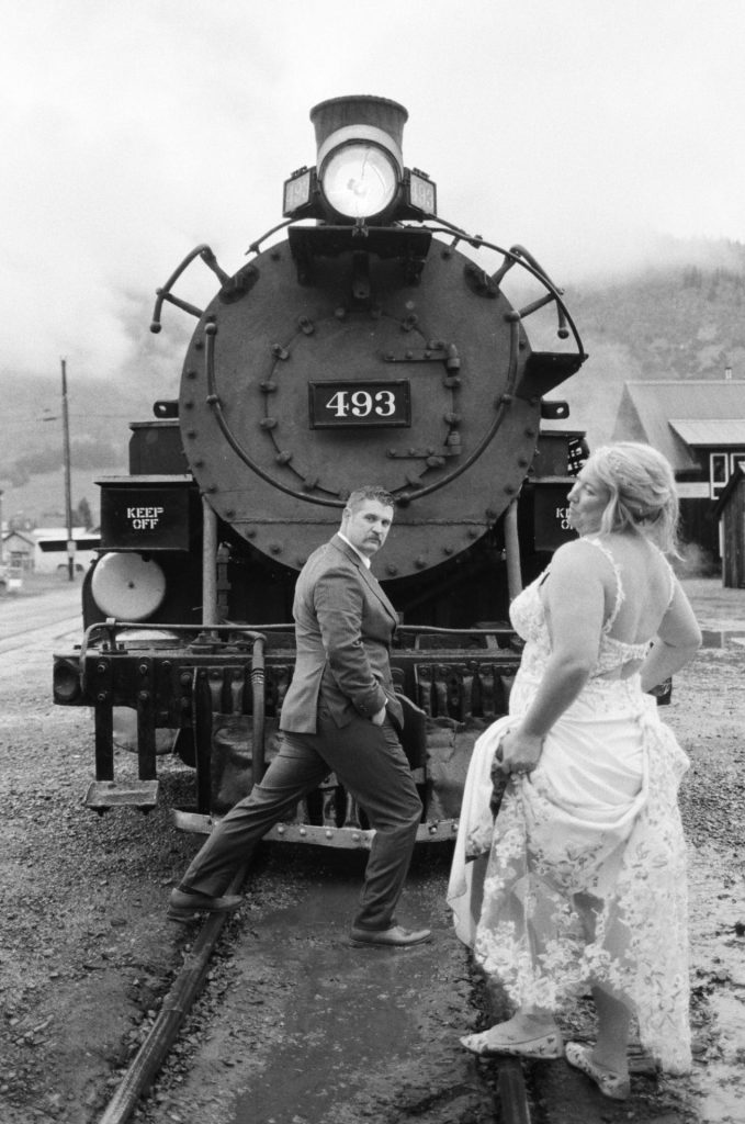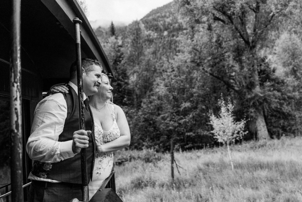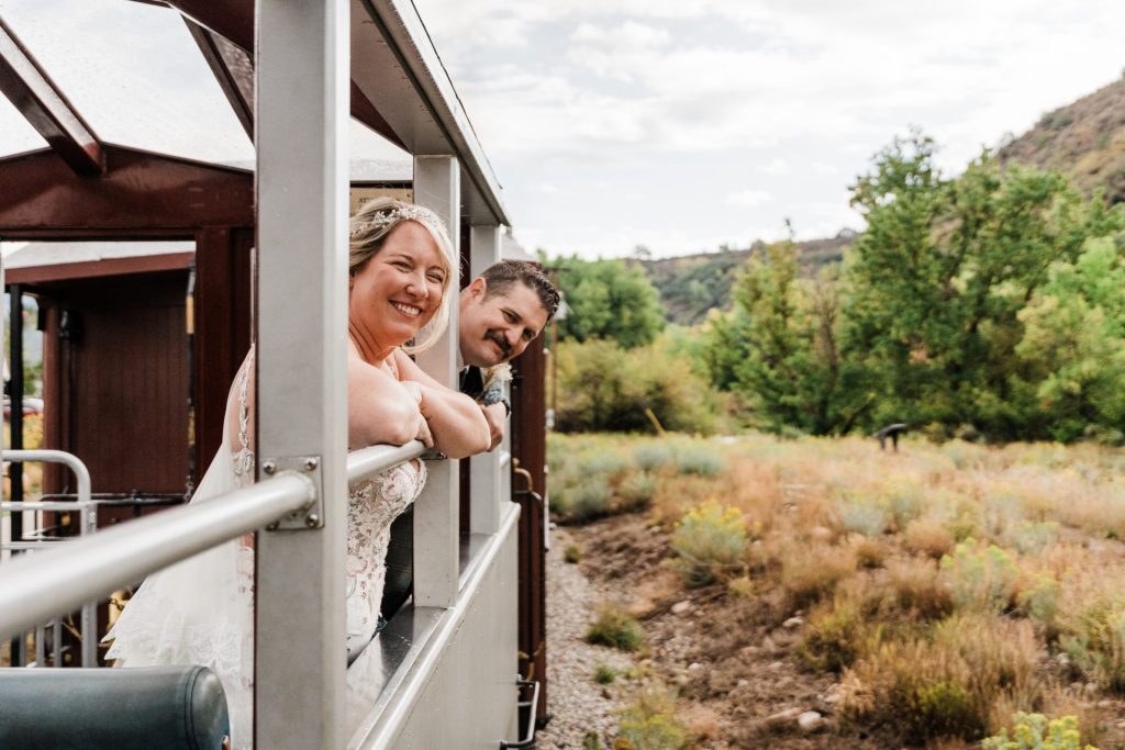 Their wedding day kicked off in true Colorado style—with unpredictable weather. Chelsea got ready at the General Palmer Hotel in Durango, sharing moments with mom and dad as they helped her into her dress, while Zach prepped in the hotel lobby, perfecting his tie and jacket for the big day. A first look set the tone for the day, intimate and full of anticipation, before the couple walked the short distance to the train depot to board the Durango Silverton Narrow Gauge Railroad. As the train chugged along the mountains, they said their vows, signed the marriage license, and celebrated with cake and breakfast while small family photos captured the start of their married life. The day’s adventure was only heightened by the weather—shortly after their ceremony, the skies opened up and rain poured down for the rest of the day, adding a dramatic soundtrack to their journey.