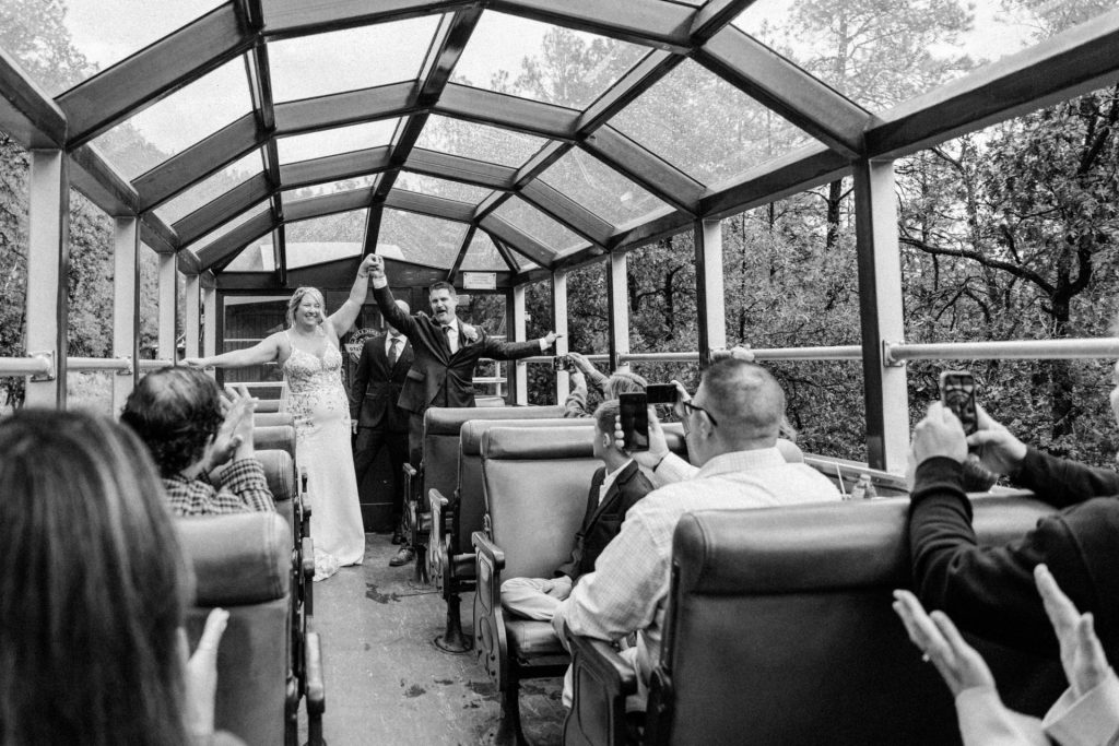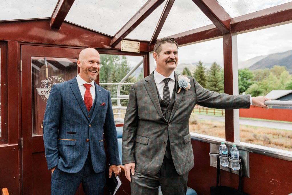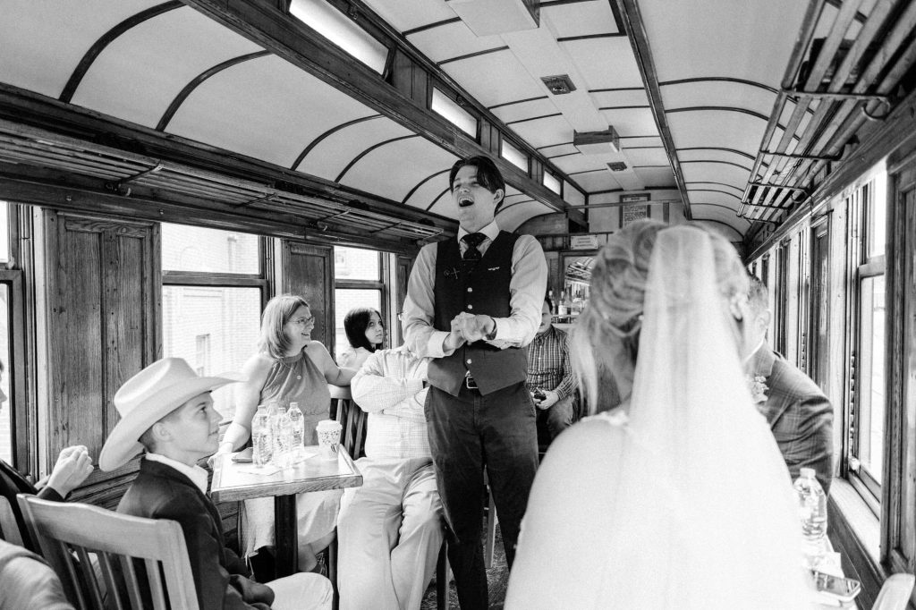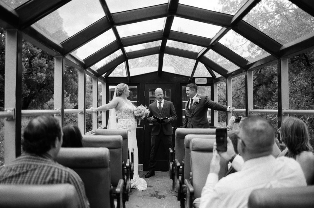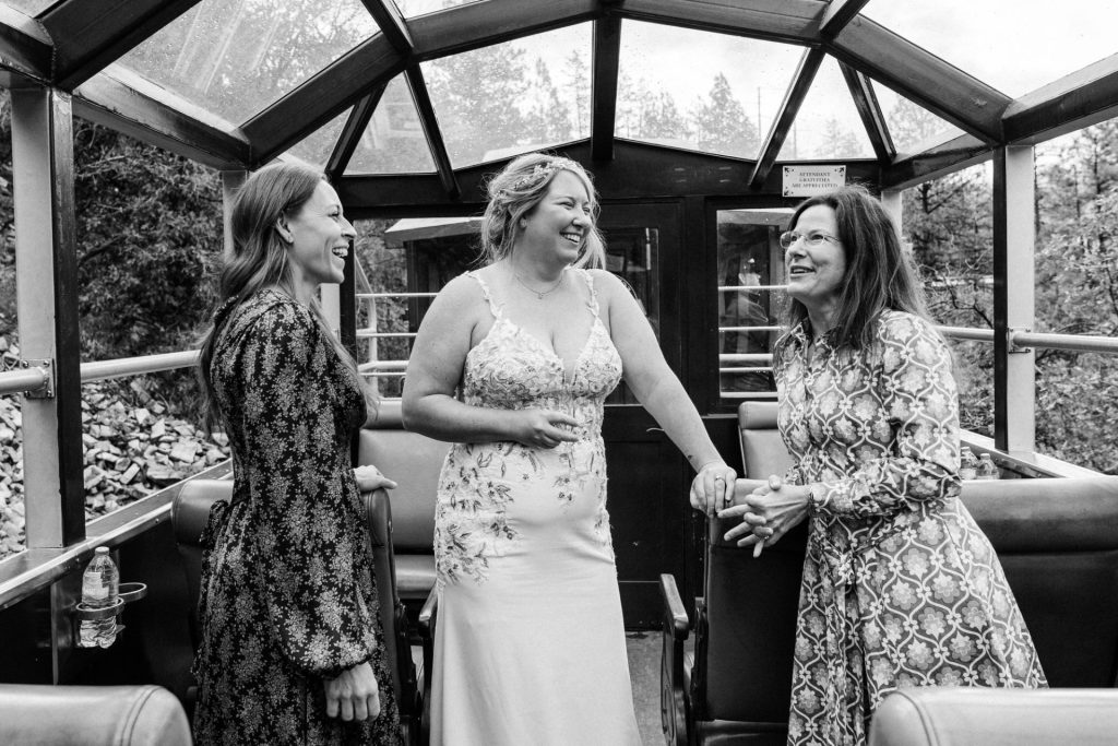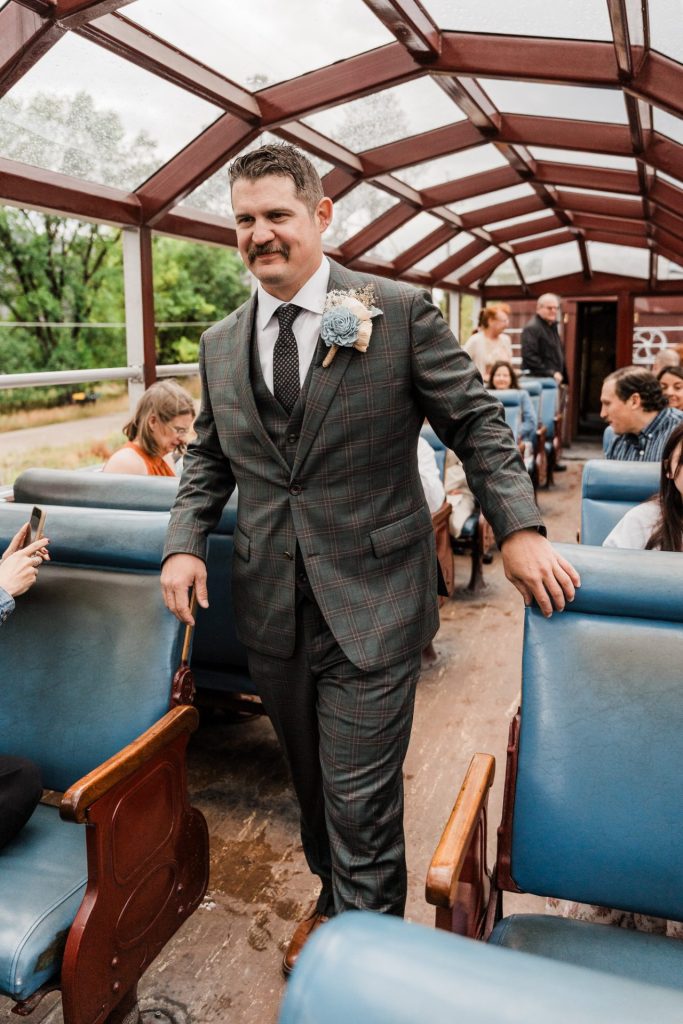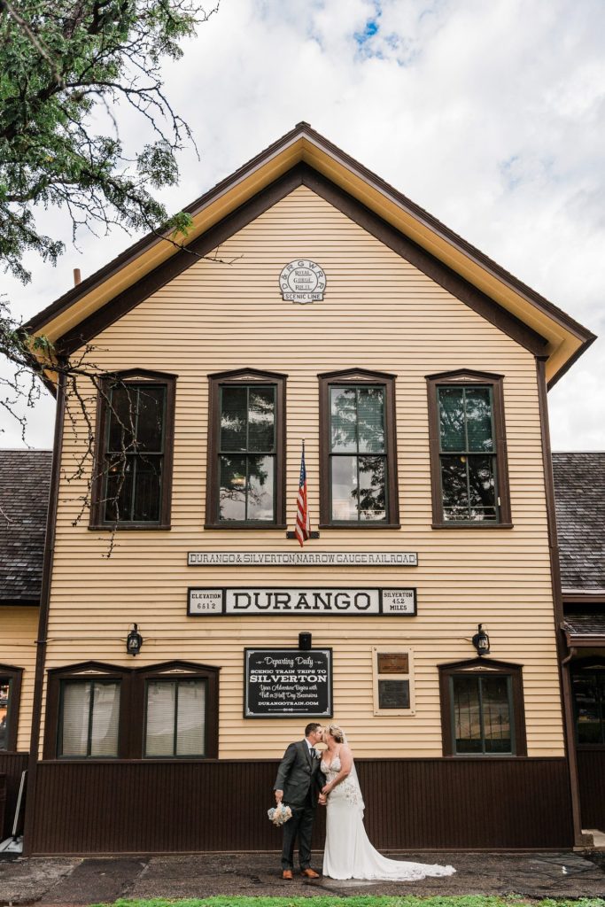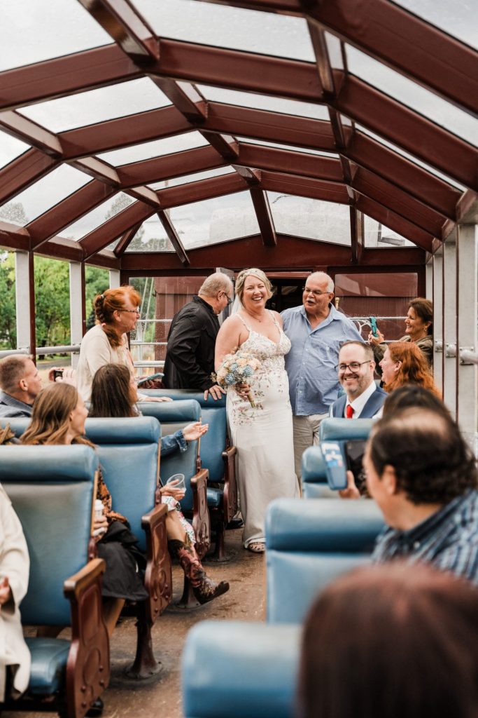 Their wedding day kicked off in true Colorado style—with unpredictable weather. Chelsea got ready at the General Palmer Hotel in Durango, sharing moments with mom and dad as they helped her into her dress, while Zach prepped in the hotel lobby, perfecting his tie and jacket for the big day. A first look set the tone for the day, intimate and full of anticipation, before the couple walked the short distance to the train depot to board the Durango Silverton Narrow Gauge Railroad. As the train chugged along the mountains, they said their vows, signed the marriage license, and celebrated with cake and breakfast while small family photos captured the start of their married life. The day’s adventure was only heightened by the weather—shortly after their ceremony, the skies opened up and rain poured down for the rest of the day, adding a dramatic soundtrack to their journey.