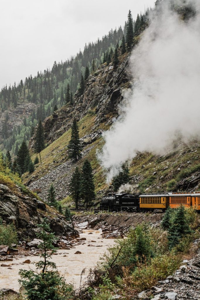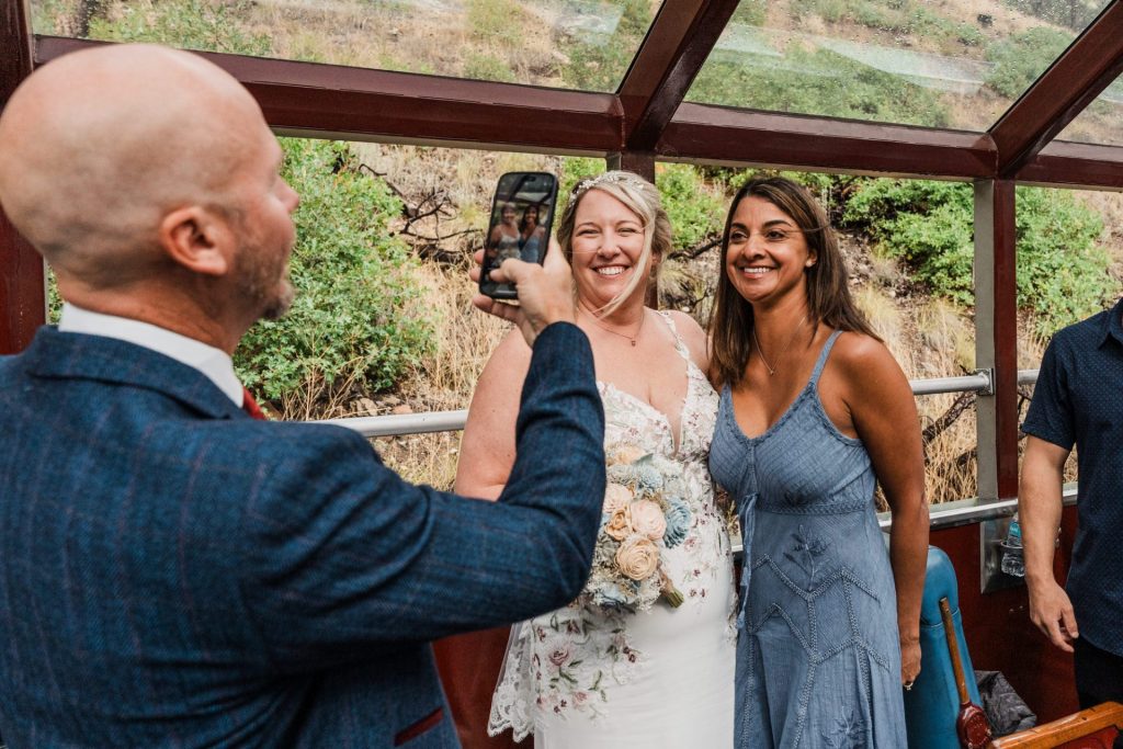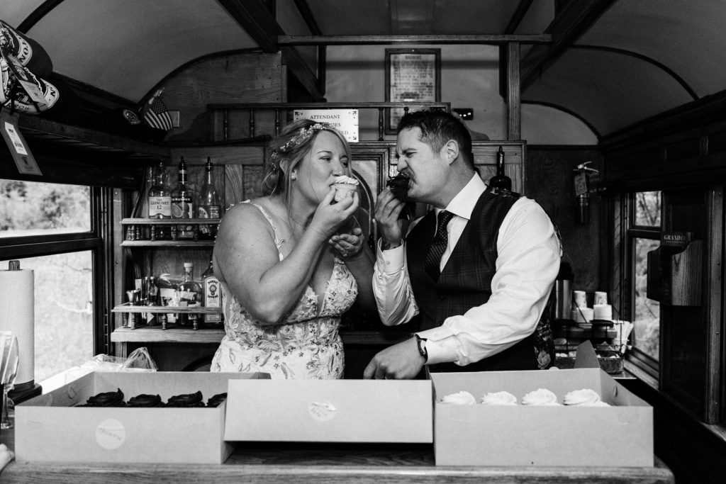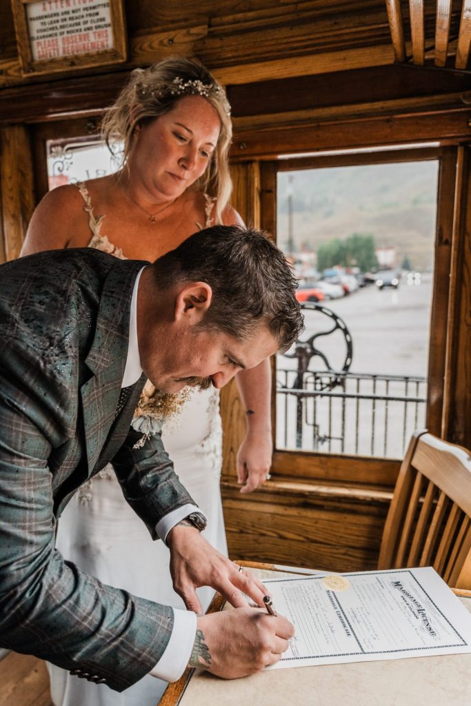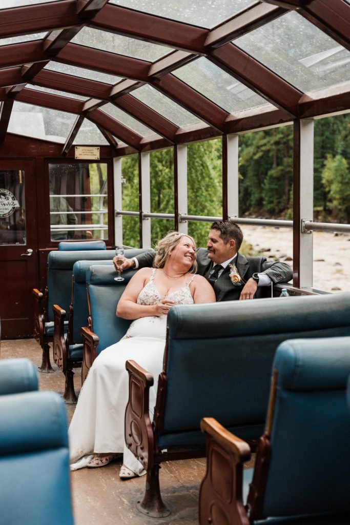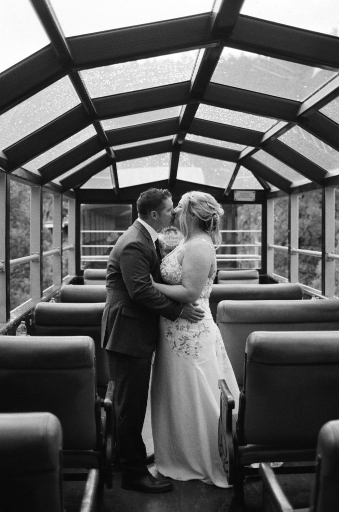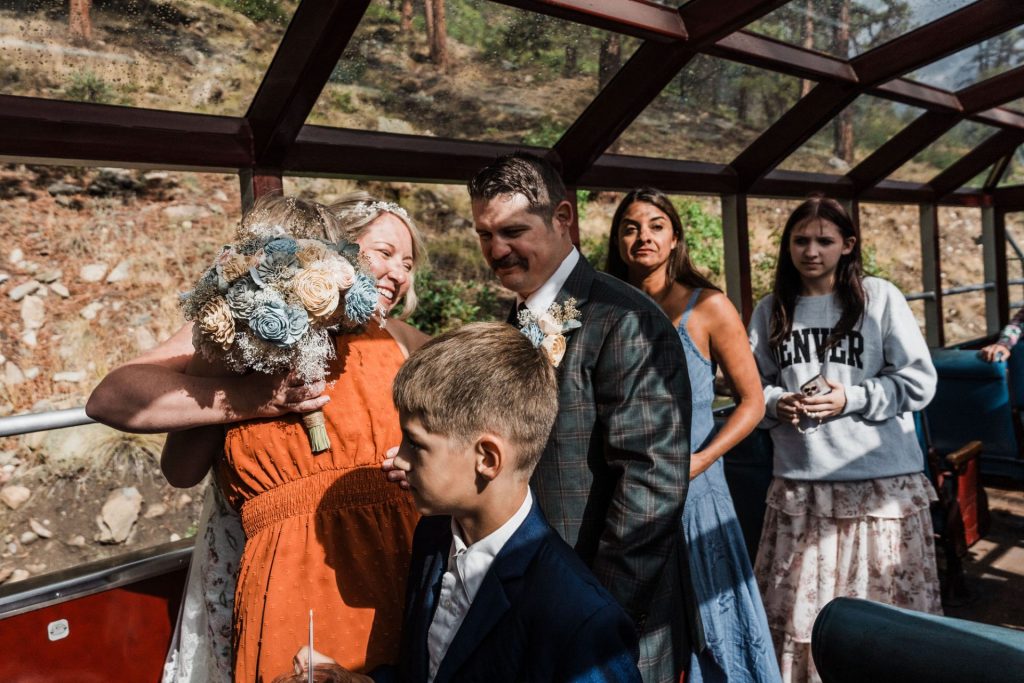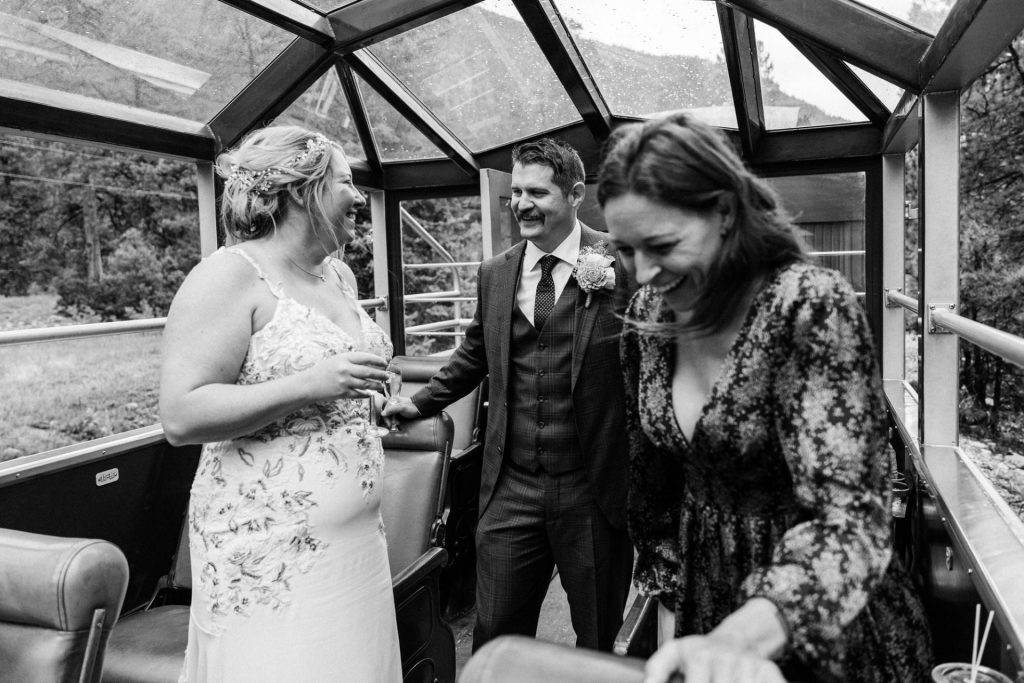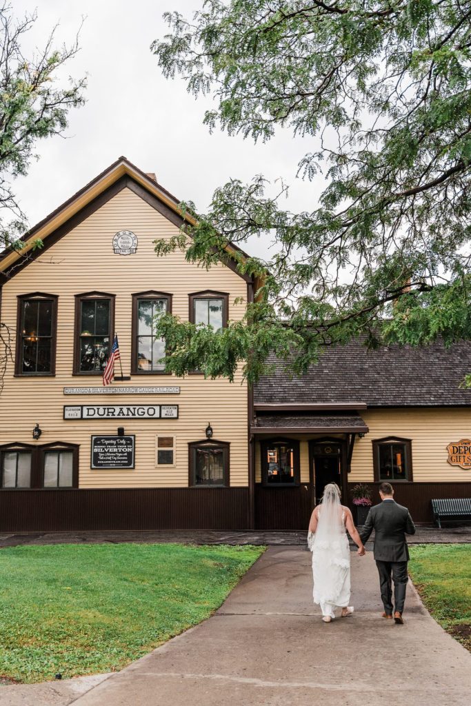 Their wedding day kicked off in true Colorado style—with unpredictable weather. Chelsea got ready at the General Palmer Hotel in Durango, sharing moments with mom and dad as they helped her into her dress, while Zach prepped in the hotel lobby, perfecting his tie and jacket for the big day. A first look set the tone for the day, intimate and full of anticipation, before the couple walked the short distance to the train depot to board the Durango Silverton Narrow Gauge Railroad. As the train chugged along the mountains, they said their vows, signed the marriage license, and celebrated with cake and breakfast while small family photos captured the start of their married life. The day’s adventure was only heightened by the weather—shortly after their ceremony, the skies opened up and rain poured down for the rest of the day, adding a dramatic soundtrack to their journey.
