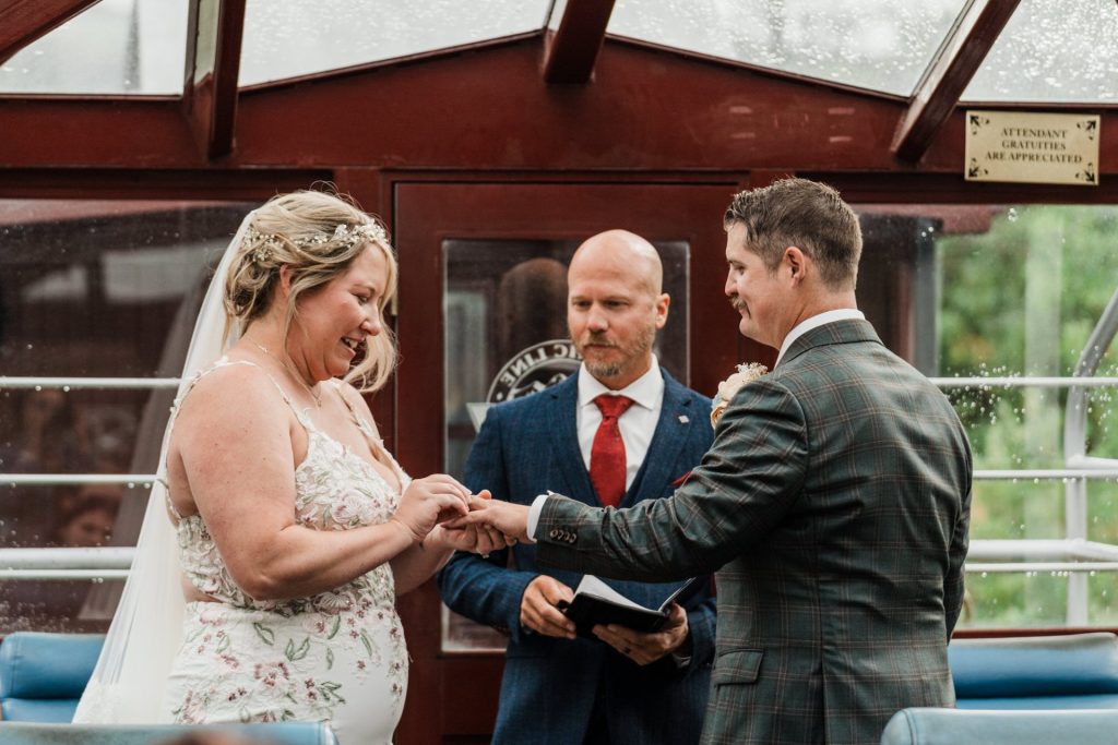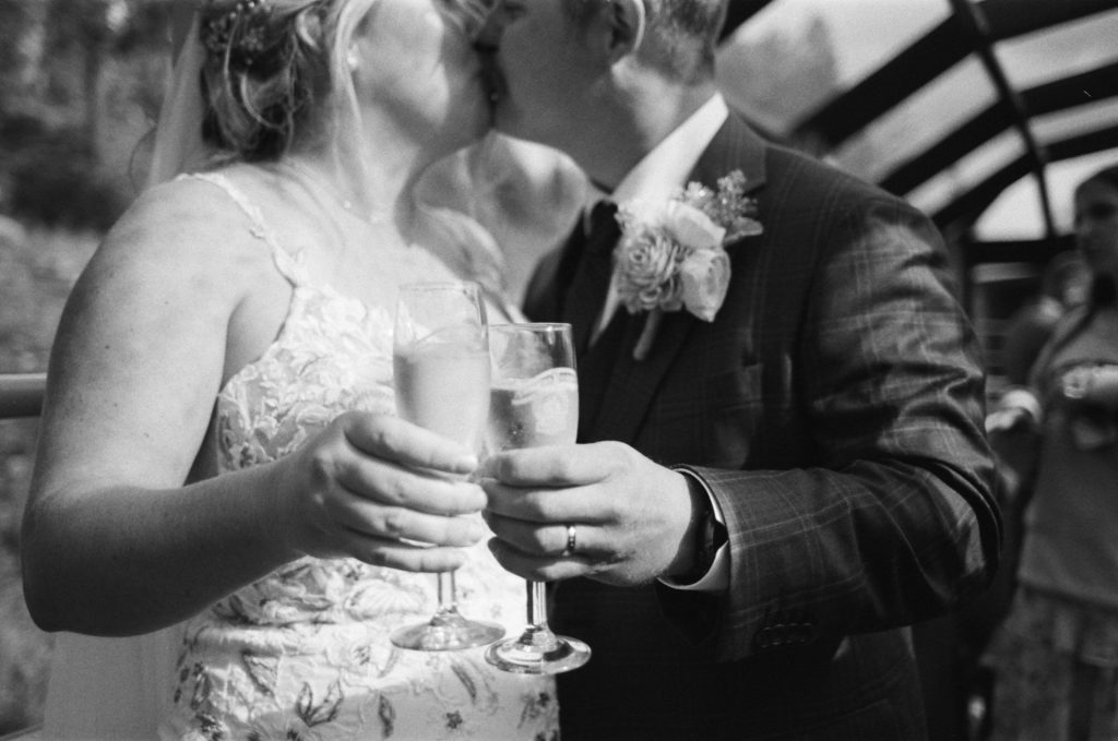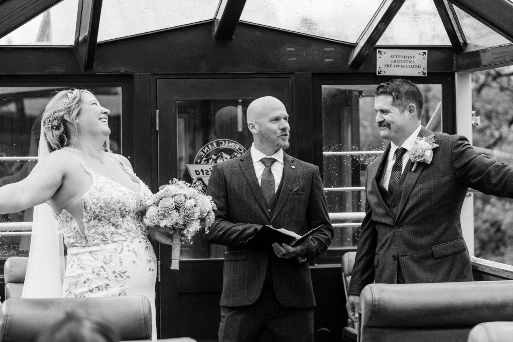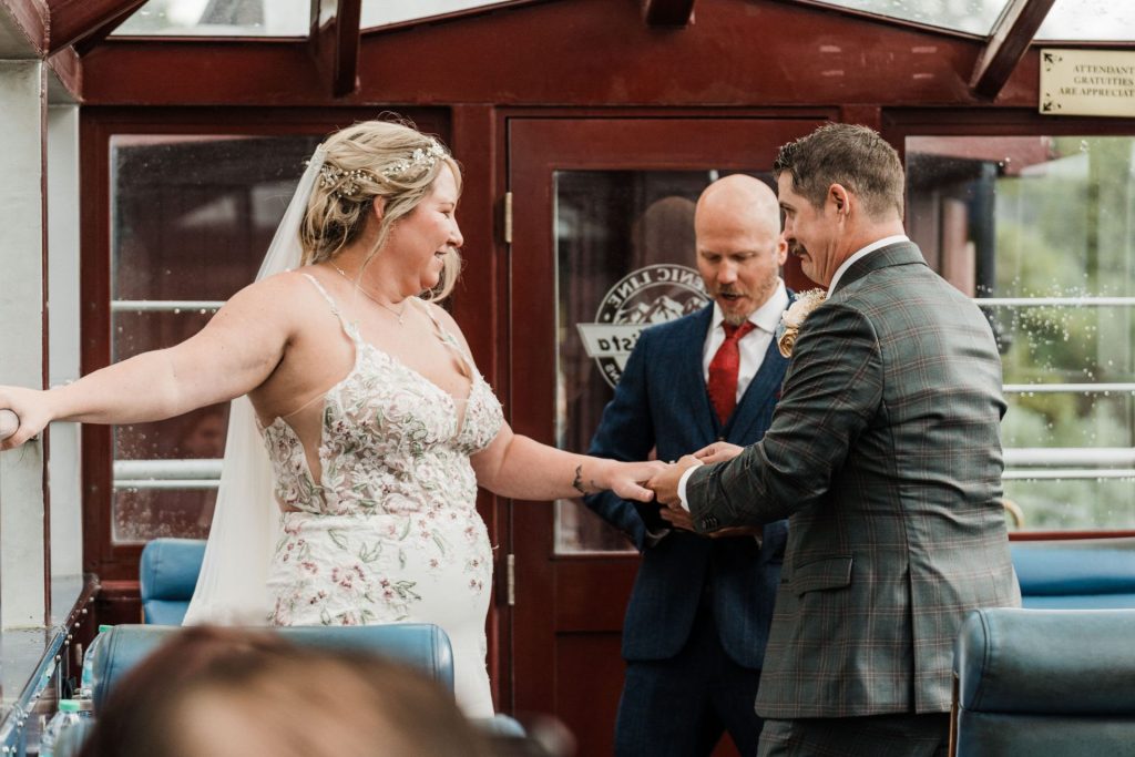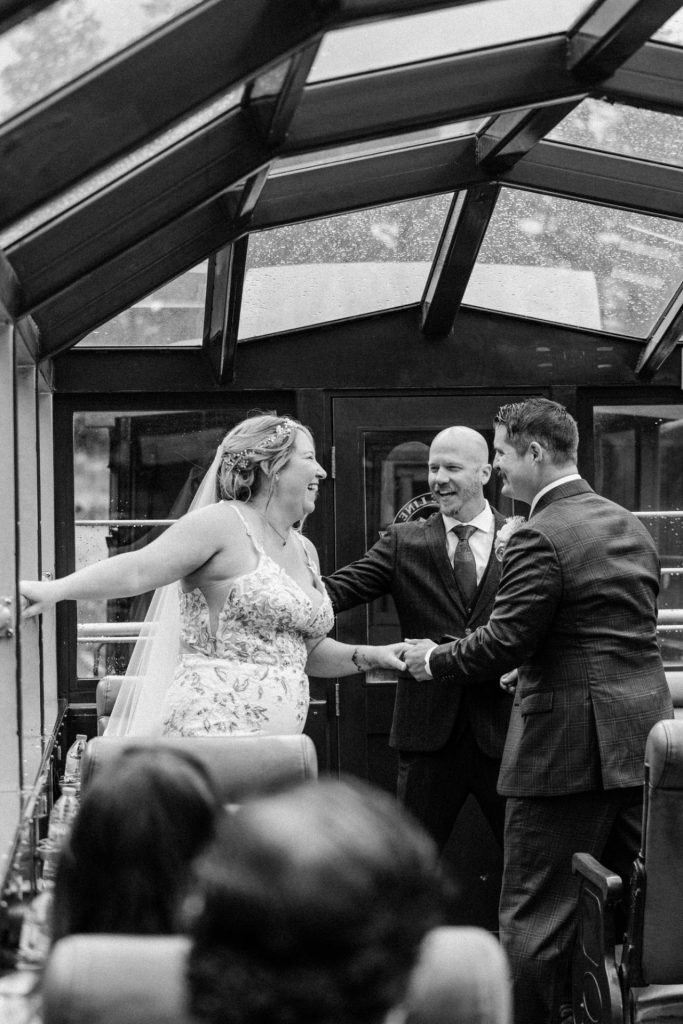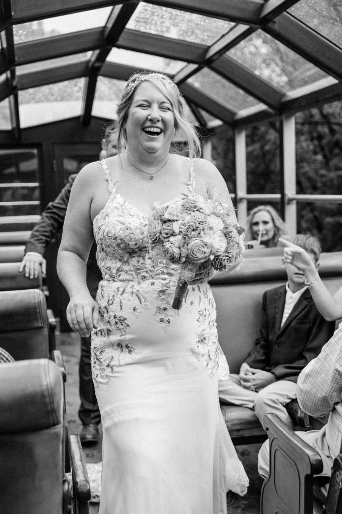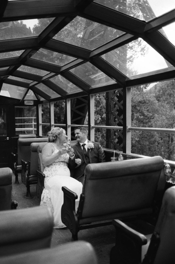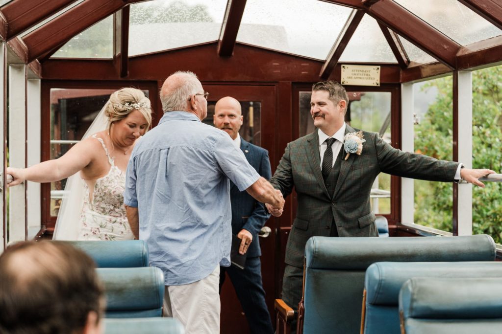 Their wedding day kicked off in true Colorado style—with unpredictable weather. Chelsea got ready at the General Palmer Hotel in Durango, sharing moments with mom and dad as they helped her into her dress, while Zach prepped in the hotel lobby, perfecting his tie and jacket for the big day. A first look set the tone for the day, intimate and full of anticipation, before the couple walked the short distance to the train depot to board the Durango Silverton Narrow Gauge Railroad. As the train chugged along the mountains, they said their vows, signed the marriage license, and celebrated with cake and breakfast while small family photos captured the start of their married life. The day’s adventure was only heightened by the weather—shortly after their ceremony, the skies opened up and rain poured down for the rest of the day, adding a dramatic soundtrack to their journey.