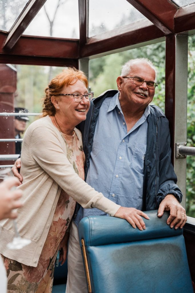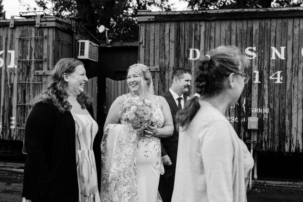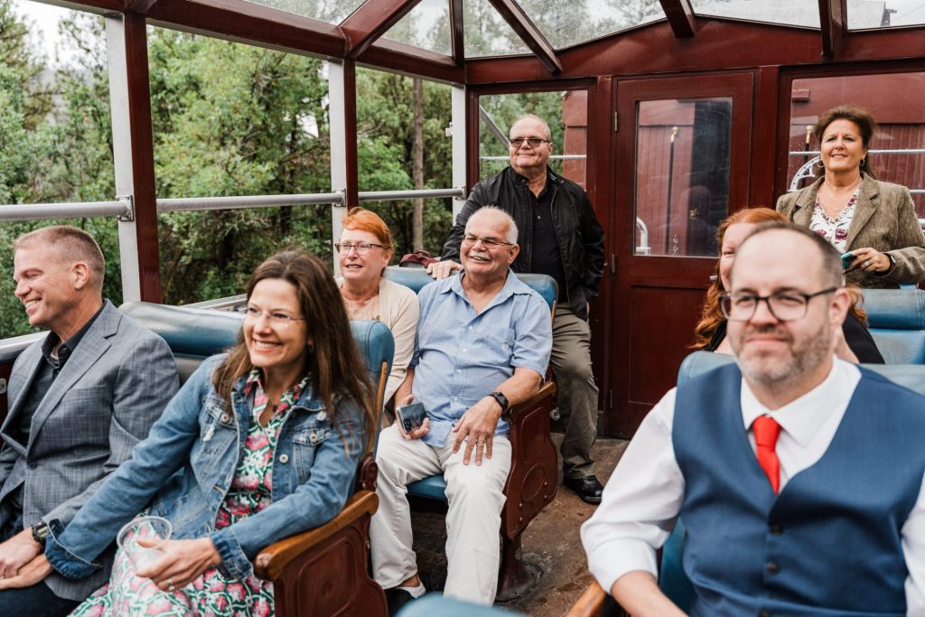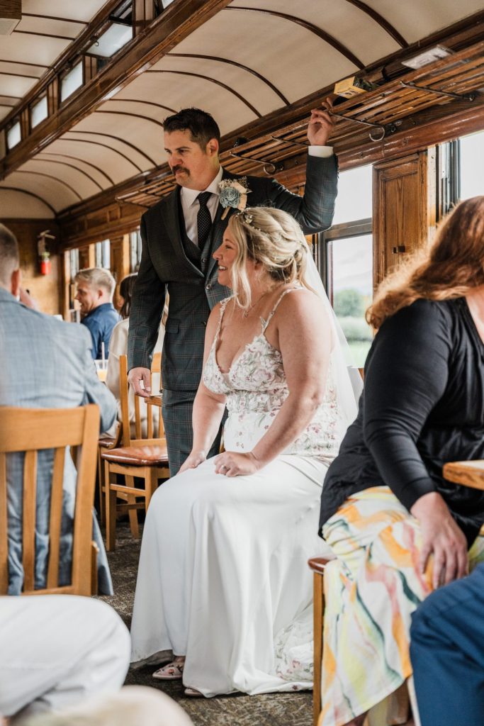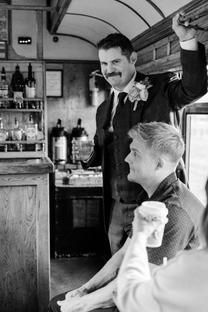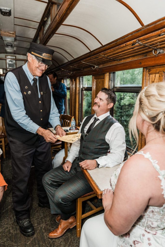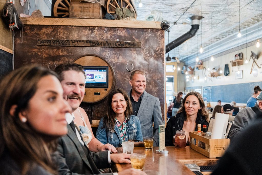 Once the train arrived in Silverton, Chelsea and Zach enjoyed lunch with their family, sharing laughter and stories as the rain continued to fall outside. Later, they stopped by a local brewery to grab a drink with friends, soaking in the cozy atmosphere before boarding the train back to Durango. These little moments—eating together, sharing a toast, and capturing a few more photos with their loved ones—made the day feel personal and full of connection.