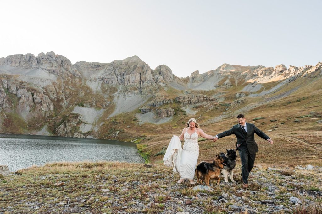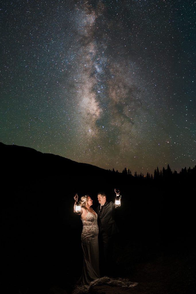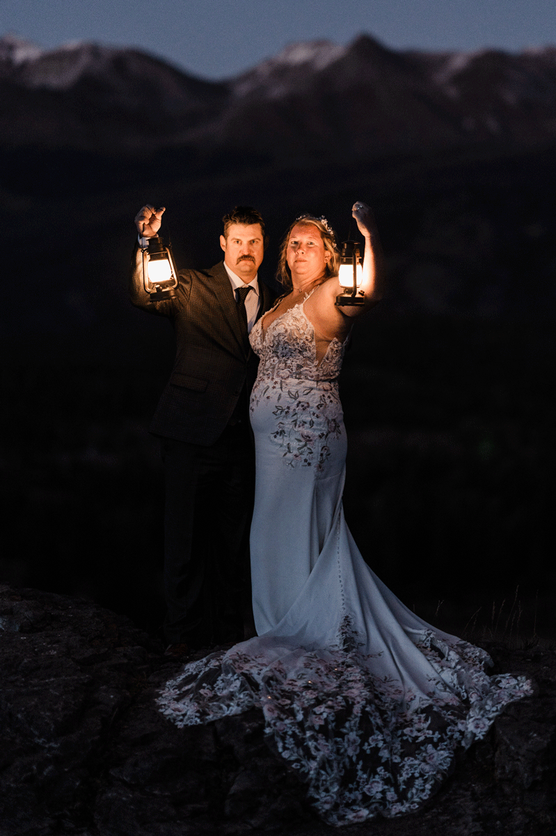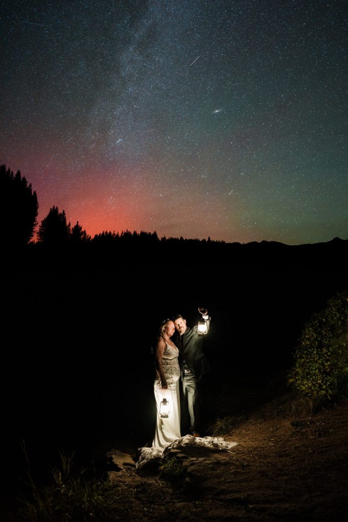 The following day, what was initially planned as part of their first-day adventure had to be postponed due to severe thunderstorms. But in classic Chelsea-and-Zach fashion, this twist became a blessing in disguise. They spent the second half of their Silverton elopement exploring a 4×4 trail and an alpine lake, capturing photos along the way and enjoying time with their two dogs, Maximus and Bomber, who brought their own brand of energy and love to the day. As the sun began to set and the Milky Way rose, the clear skies offered them the rare and magical chance to see the northern lights all the way down in Silverton—a moment that felt like a reward for all their patience.