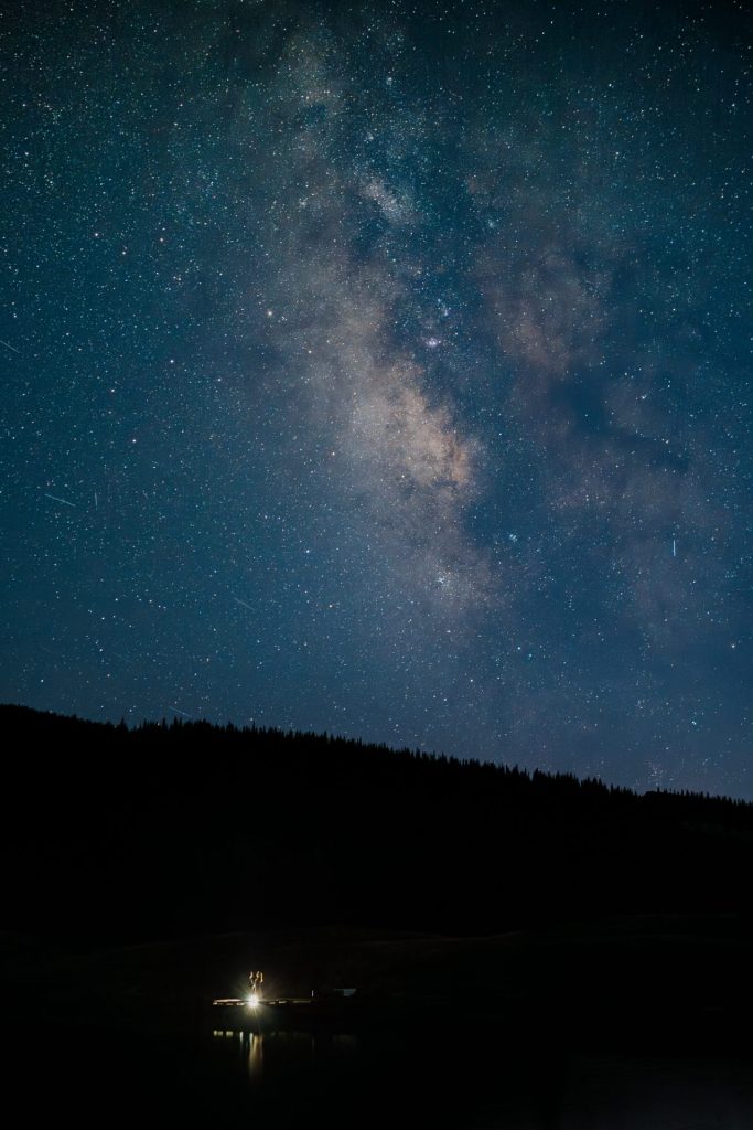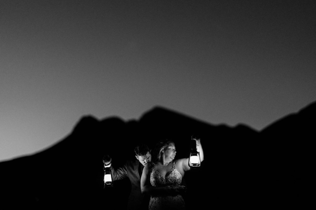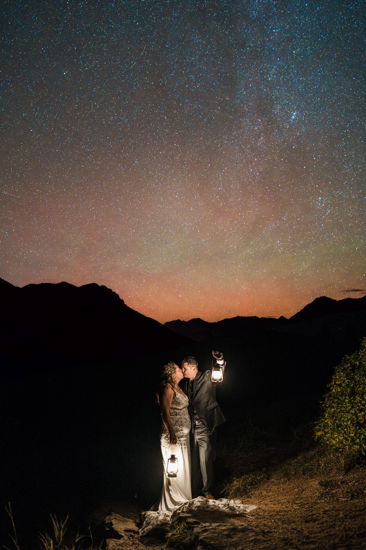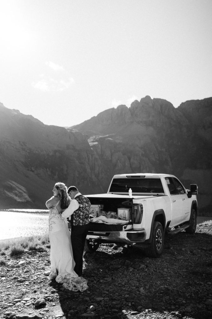 The following day, what was initially planned as part of their first-day adventure had to be postponed due to severe thunderstorms. But in classic Chelsea-and-Zach fashion, this twist became a blessing in disguise. They spent the second half of their Silverton elopement exploring a 4×4 trail and an alpine lake, capturing photos along the way and enjoying time with their two dogs, Maximus and Bomber, who brought their own brand of energy and love to the day. As the sun began to set and the Milky Way rose, the clear skies offered them the rare and magical chance to see the northern lights all the way down in Silverton—a moment that felt like a reward for all their patience.