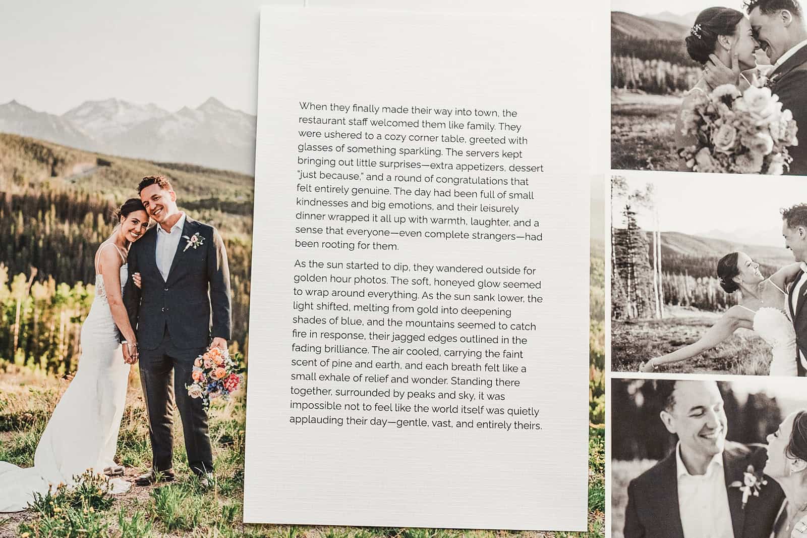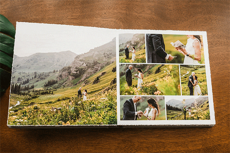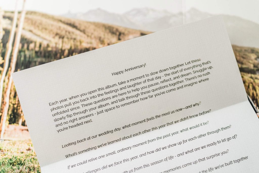 Each duplicate album includes the same album cover, embossing, layout, and number of spreads as your main album, and is printed on fingerprint-resistant Fuji Lustre paper. They do not include the watercolor map, narrative, printed vows, or anniversary prompts.