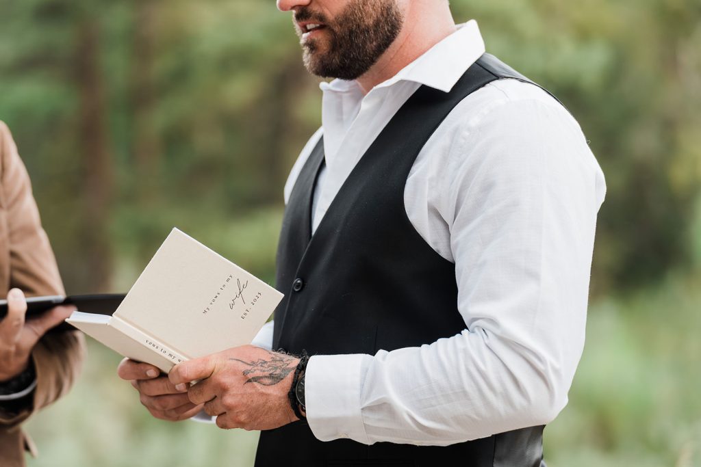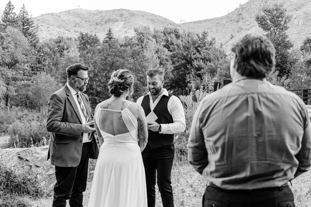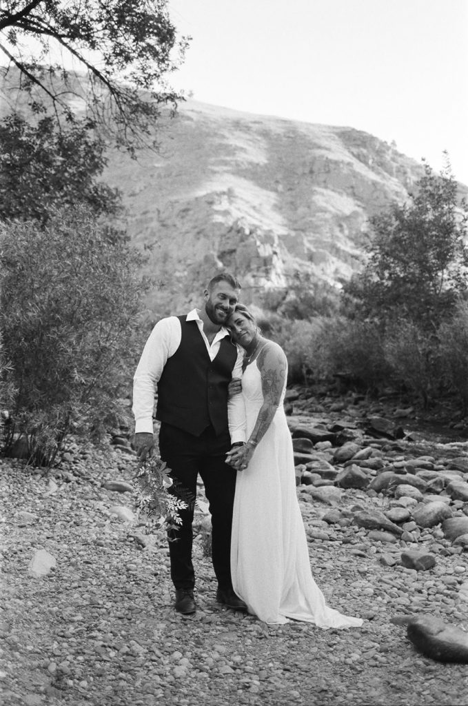 Their officiant and friend led the ceremony as the first blush of alpenglow spread across the canyon walls. That pink, golden light wrapped around them as they shared vows, exchanged rings, and signed their marriage license on a flat rock beside the river. It was quiet, intentional, and filled with that kind of magic you can’t plan—it just happens.
