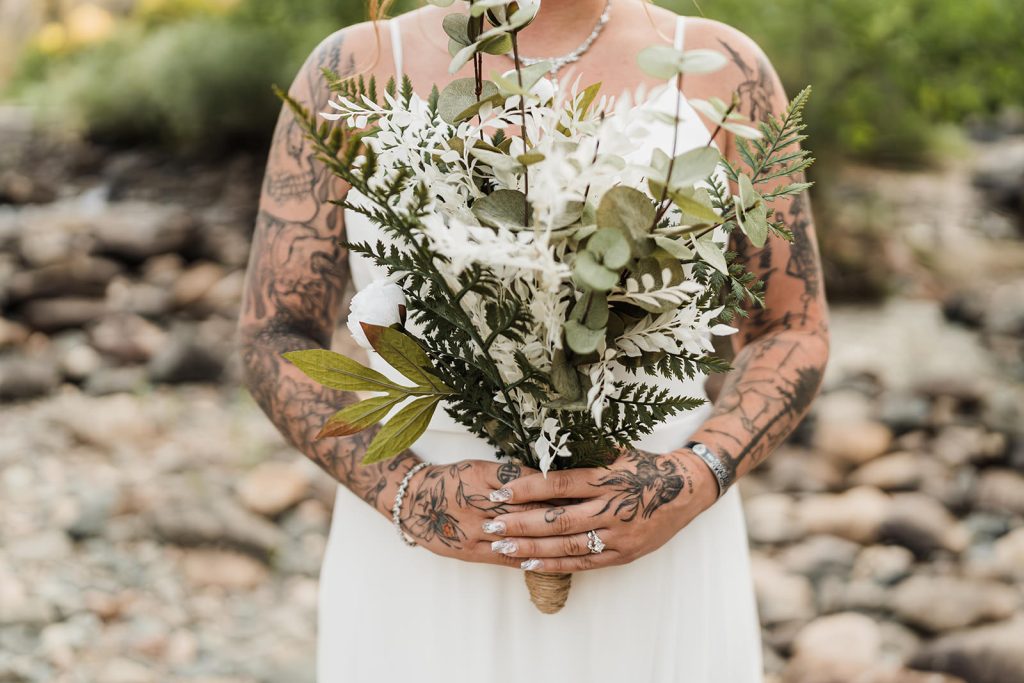 The morning of their elopement, Poudre Canyon was still and peaceful. The river moved slowly beside them, deer wandered along the banks, and the only other souls around were a couple of early-morning fly fishers casting in the soft light. Derek and Jess arrived just before sunrise and walked hand in hand to their ceremony spot—a small, secluded clearing by the water that felt like it had been waiting just for them.